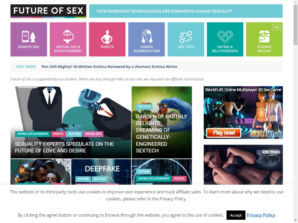 Future of Sex is the world's leading publication on how technology is changing human sexuality, including remote sex, sex robots, VR, AI, augmentation, and more